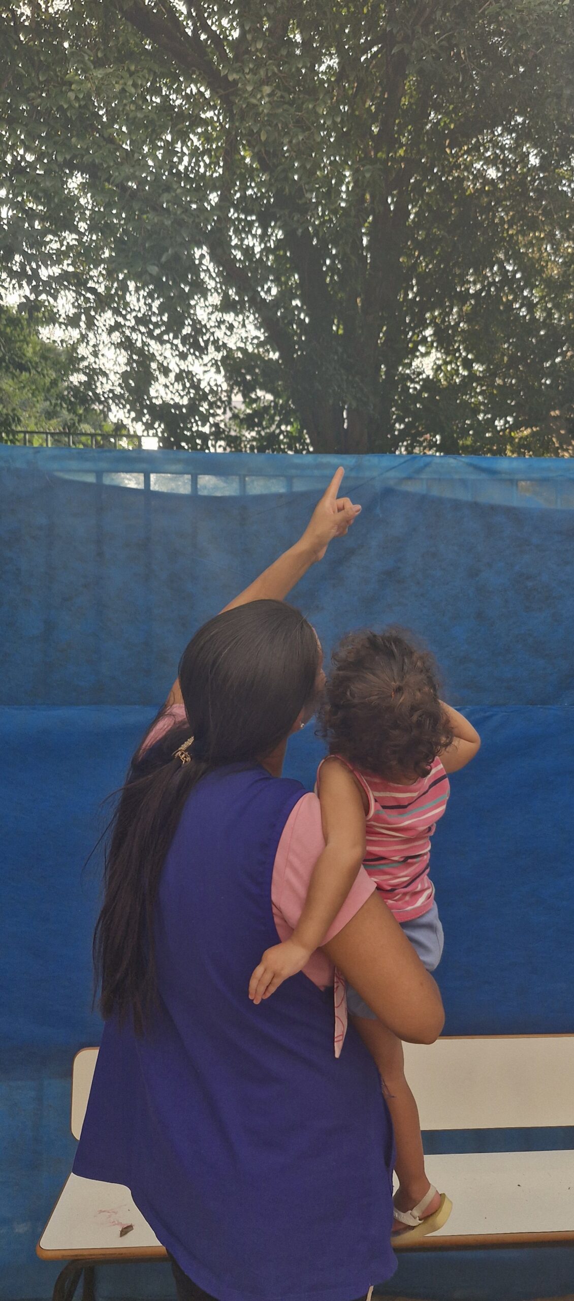 Diante da situação, uma colaboradora foi convidada a acolhê-la. Com sensibilidade, tomou Lívia nos braços e, com o intuito de confortá-la, começou a caminhar pelo espaço, oferecendo presença e segurança naquele momento de fragilidade.